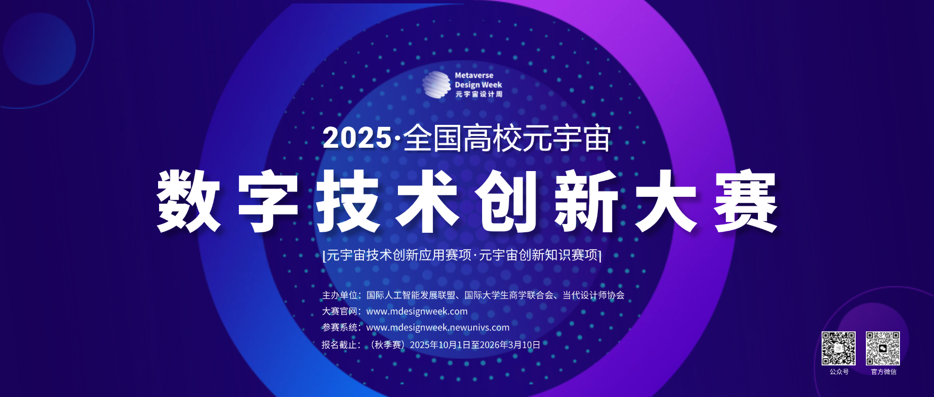 为积极响应国家关于加快发展数字经济、推动科技创新的战略部署,进一步挖掘元宇宙领域的创新人才,促进元宇宙技术与各行业的深度融合,2026元宇宙设计周大赛将增设全国高校元宇宙数字技术创新大赛赛道,本赛事由国际人工智能发展联盟、国际大学生商学联合会、当代设计师协会共同主办。
